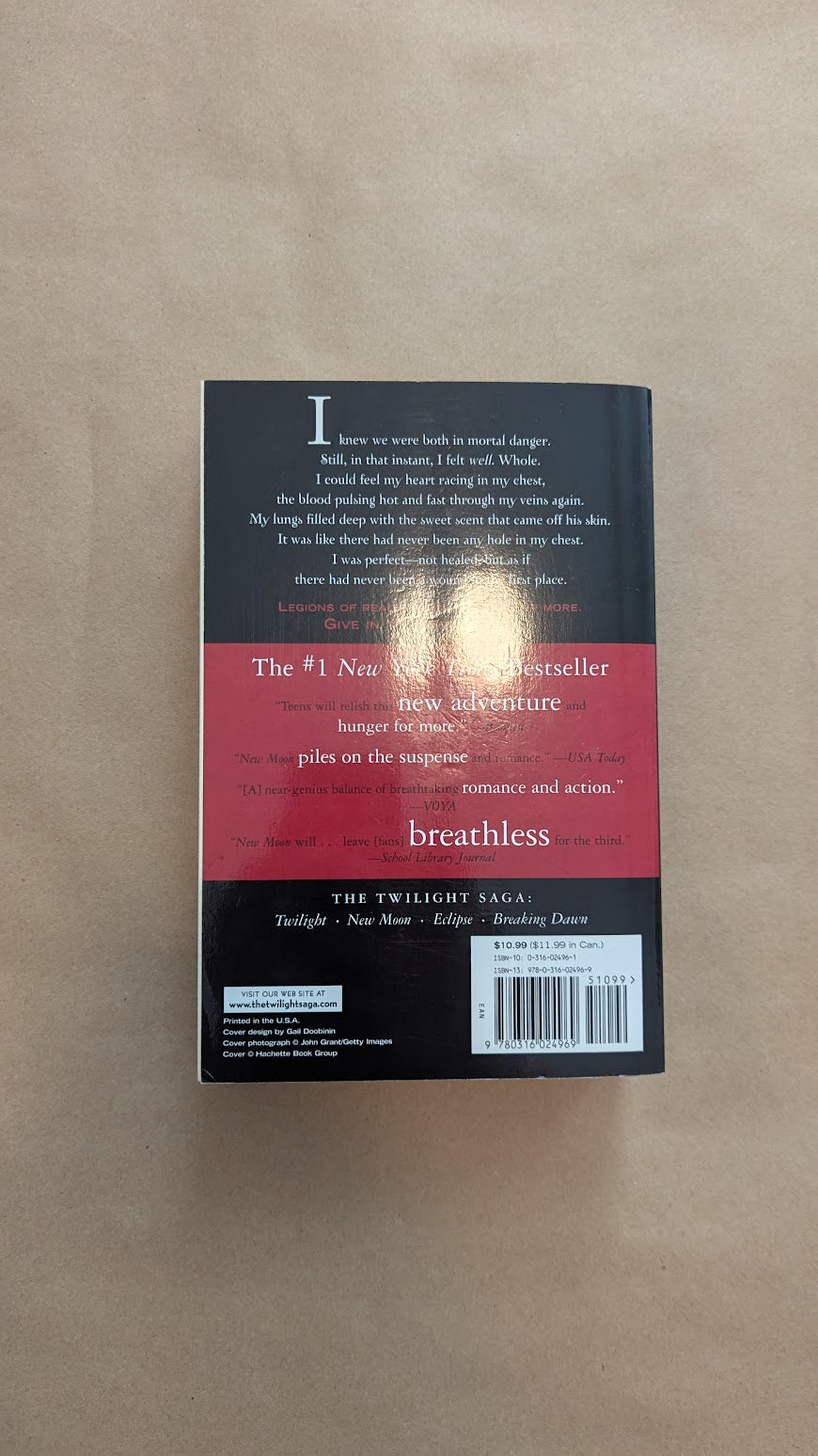 NEW MOON by Stephenie Meyer, Megan Tingley Books, Little Brown, First Paperback Edition, later Printing, May 2008, NEW. This is a LIKE-NEW Paperback book. I stuck my finger under the edge of the paper and jerked it under the tape. Shoot,' I muttered when the paper sliced my finger. A single drop of blood oozed from the tiny cut. It all happened very quickly then. No!' Edward roared Dazed and disorientated, I looked up from the bright red blood pulsing out of my arm - and into the fevered eyes of the six suddenly ravenous vampires. For Bella Swan, there is one thing more important than life Edward Cullen. But being in love with a vampire is more dangerous than Bella ever could have imagined. Edward has already rescued Bella from the clutches of an evil vampire but now, as their daring relationship threatens all that is near and dear to them, they realize their troubles may just be beginning.